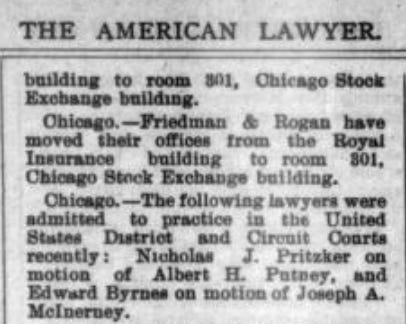 In 1885, Jacob opened a store on State Street, and Nicholas, while working as an errand boy in the U.S. Stockyards for $3 a week and attending high school classes five nights a week, felt a growing desire to become a lawyer.