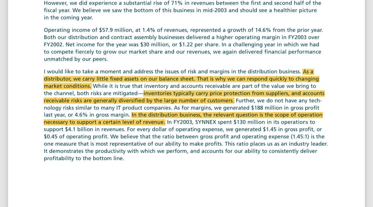 Although SNX earns thin profit margins (6-7% gross; 2% operating; 1.3% net), they earn ~25% return on tangible assets and 10% ROIC.