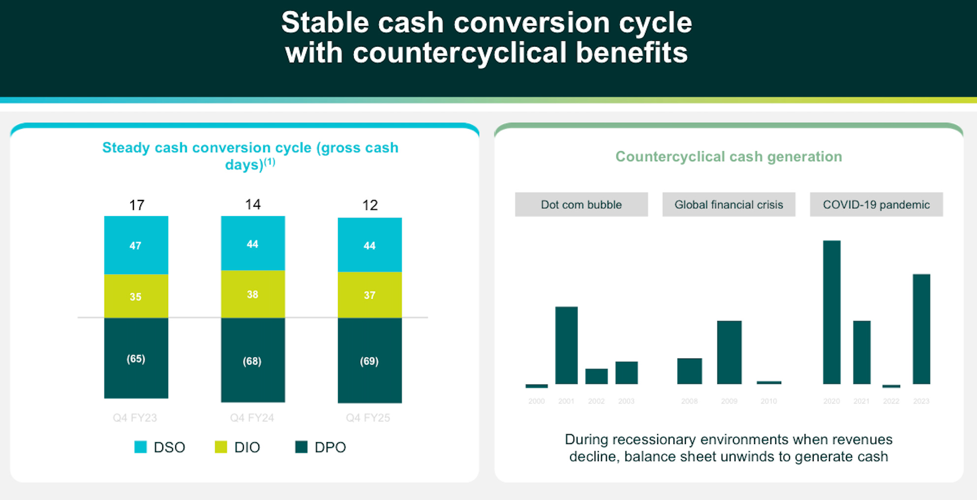 SNX’s cash conversion cycle runs about 16-23 days — meaning the company finances roughly three weeks of inventory and receivables on its balance sheet at any given time. At over $62 billion in annual revenue, that’s about $4 billion in working capital tied up in the business.