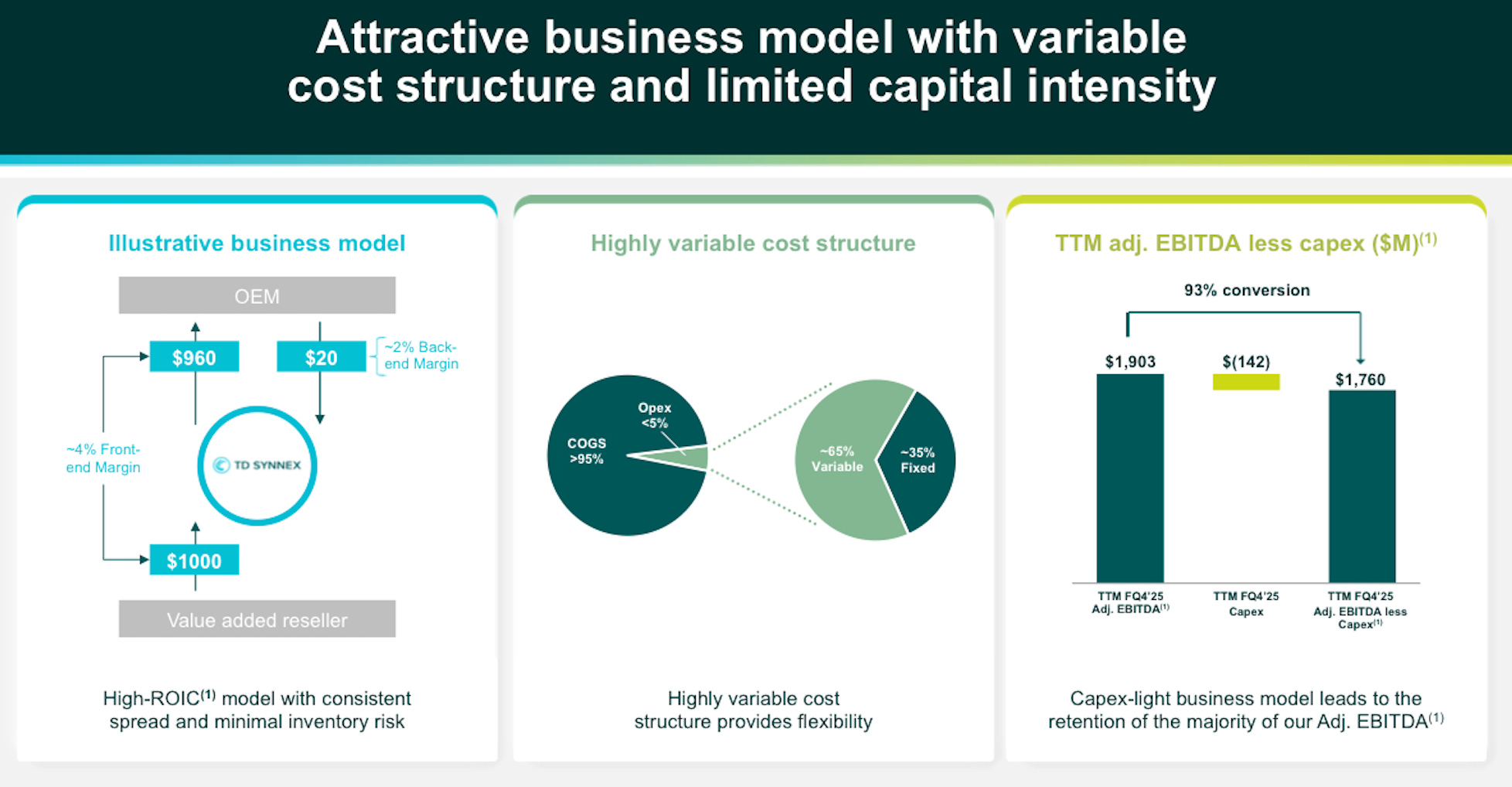 Without a middleman, either manufactures tie up money in unsold goods or customers wait weeks for products to be produced. The distribution and logistics model acts as a shock absorber for the industry, allowing TD SYNNEX to sit in-between and absorb the mismatch. As a result, margins are thin and scale matters.